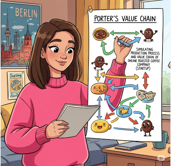 Simuliere Produktionsprozess und Wertschöpfungskette eines Start-ups, das Online-Kaffee verkauft.