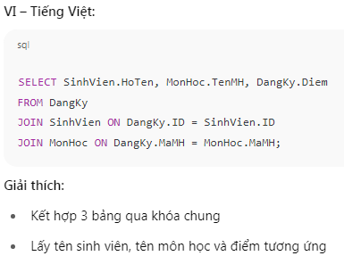 1. JOIN cơ bản: Lấy điểm sinh viên và tên môn học