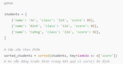 → Hãy tạo danh sách như: [(A, 3), (B, 3), (C, 2)], rồi sắp xếp và theo dõi xem thứ tự của A và B có bị đảo không.