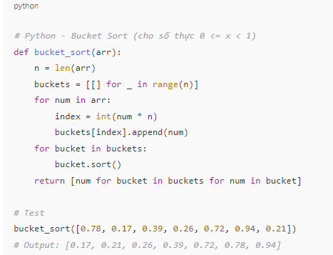 Sắp xếp từng bucket riêng bằng thuật toán bất kỳ (thường là Insertion Sort).